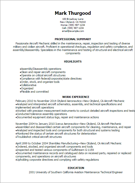 . Create a professional Resume in just 15 minutes Easy. A typical aircraft mechanic resume sample will contain a summary section followed by sections emphasizing your skills work experience and education. Bad Aircraft Mechanic Resume Example - Header Section.